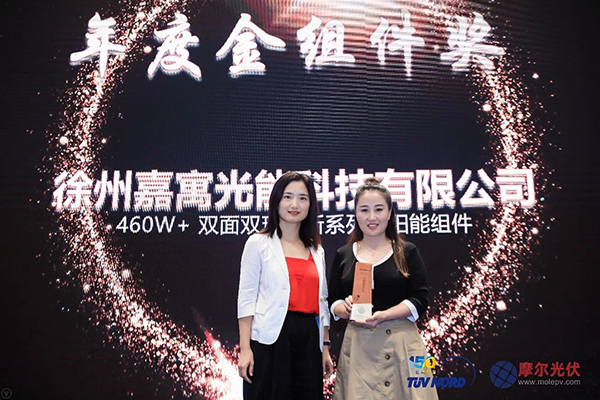 研討會(huì)議結(jié)束后,參會(huì)人士早就期待已久的“2019光伏風(fēng)向獎(jiǎng)?lì)C獎(jiǎng)典禮”在傍晚時(shí)分如約而至。本次頒獎(jiǎng)典禮是由本屆雙面發(fā)電與平價(jià)上網(wǎng)技術(shù)路線研討會(huì)組委會(huì)組織,旨在鼓勵(lì)光伏企業(yè)在光伏行業(yè)技術(shù)進(jìn)步中的創(chuàng)造性工作,促進(jìn)光伏行業(yè)技術(shù)水平的提高,早日實(shí)現(xiàn)平價(jià)上網(wǎng),獎(jiǎng)勵(lì)高水平的光伏企業(yè)及人物取得的技術(shù)成果。繼在2018年的頒獎(jiǎng)典禮獲得“卓效品質(zhì)獎(jiǎng)”之后,嘉寓光能在本屆2019光伏風(fēng)向獎(jiǎng)?lì)C獎(jiǎng)典禮上更進(jìn)一步,一舉摘得“金組件”大獎(jiǎng)。