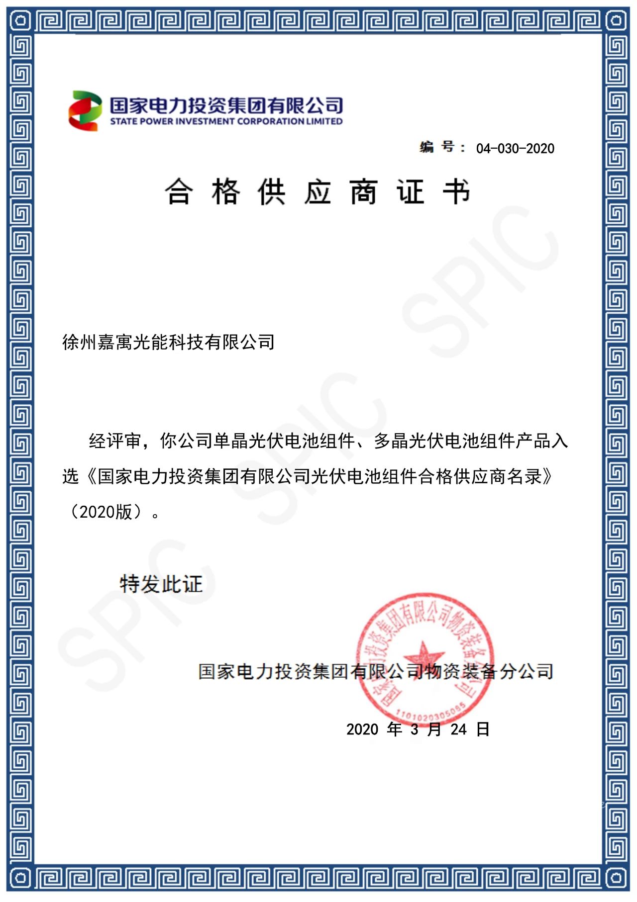暮春四月,春暖花開,嘉寓光能頻傳佳音:徐州嘉寓光能成功入選國家電力投資集團有限公司光伏電池組件合格供應商名錄。