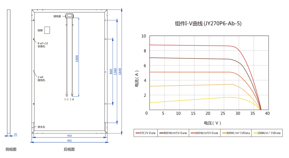 標準測試條件:大氣質量AM1.5,輻照度1000W/ ㎡,電池溫度25℃. |